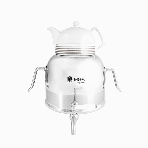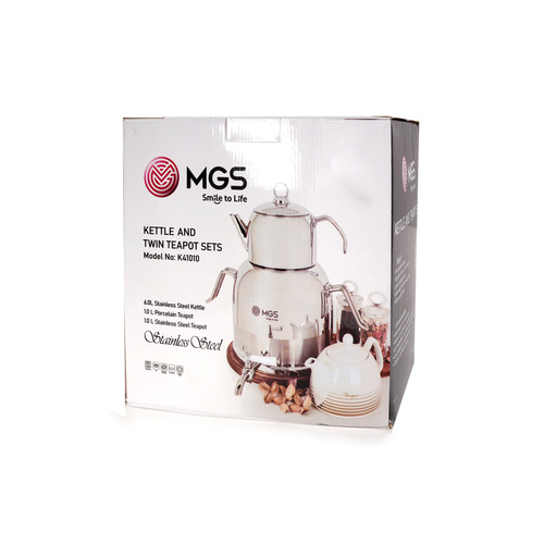 ست کتری و قوری «MGS» (ام جی اس) مدل k 41010جایگزین مناسبی برای تعویض کتری و قوری قدیمی آشپزخانهتان خواهد بود. کتری ست از فلز استیل ساخته شده است تا در برابر حرارت مستقیم اجاقگاز صدمه نبیند. استیل بهکاررفته در کتری علاوه بر مقاومت مطلوب در برابر گرما و حرارت، ضدزنگ است و وجود آب داخل محفظهی آن باعث زنگزدگیاش نخواهد شد. این ست زیبا دارای دو قوری از جنس فلز و چینی میباشد.