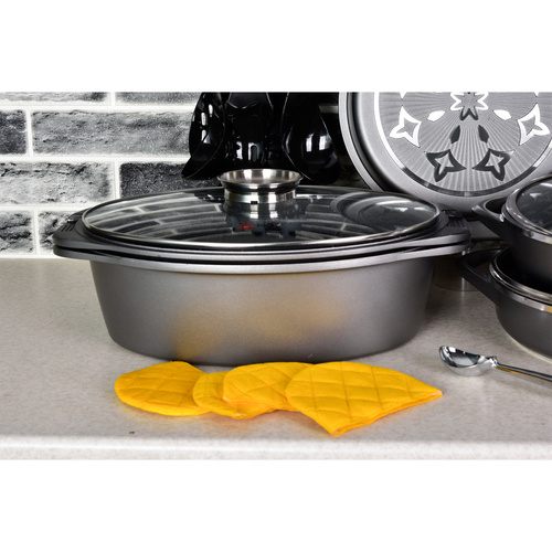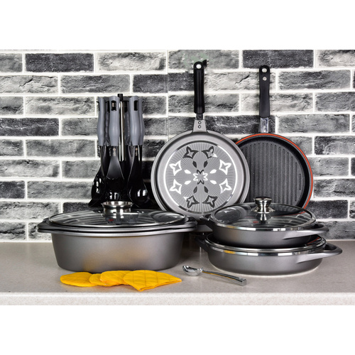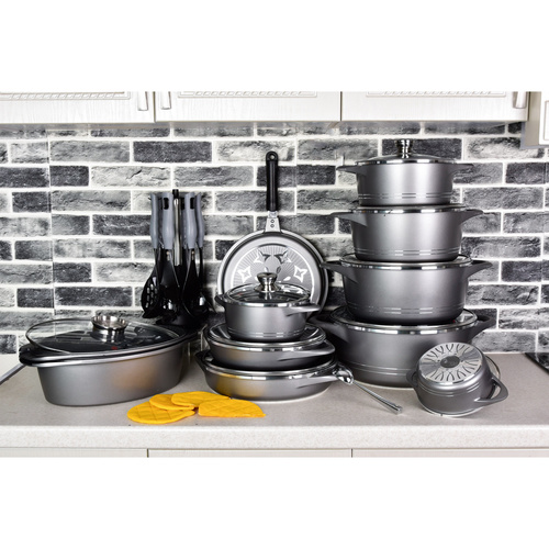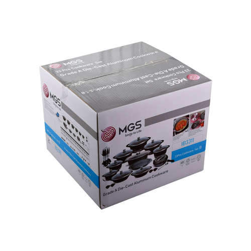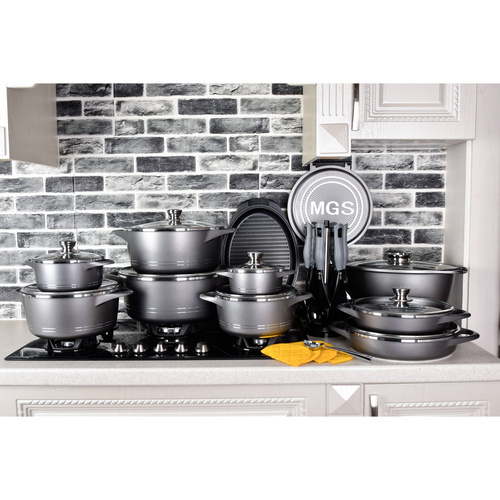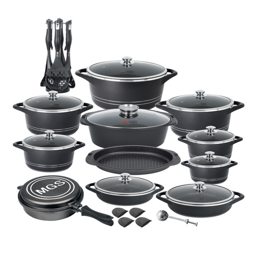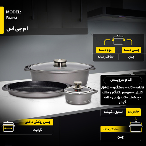 سرویس پخت و پز 33 پارچه MGS طرح ایتالیا B تجربهای کامل برای آشپزی روزمره به همراه تمام نیازهای خانواده فراهم آورده است. نوع کالا شامل قابلمه، تابه و ابزار آشپزی متنوع با پوشش گرانیتی است. اقلام سرویس شامل قابلمههای قطر 16، 20، 24، 28، 32 و 36 سانتیمتر؛ دو تابه دو دسته در قطر 28 و 32 سانتیمتر، تابه رژیمی گرد 28 سانتیمتری، تابه ویژه مرغ و ماهی بیضی 38 سانتیمتری همراه درب پیرکس مشترک و قالب گریل ومرغپز 38 سانتیمتری، ست هفتتکه کفگیر و ملاقه، چهار عدد دستگیره و یک پیشبند. کشور مبدا برند ایران است با اصالت آلمانی در طراحی . تعداد کل قطعات برابر 33 عدد ، ساختار بدنه از چدن همراه کف دو جداره است. پوشش داخلی گرانیتی چندلایه نچسب و ضدخش است . دستهها از جنس استیل و مقاومت بالایی در برابر حرارت دارند . سازگار با اجاق گاز، اجاق برقی و فر (در صورت استفاده بدون درب) .پوشش گرانیتی عملکردی در برابر حرارت تا حدود 230–250 درجه سانتیگراد دارد. ویژگیهای خاص شامل درپوشهای پیرکس با سوپاپ تخلیه بخار، کف دو جداره برای پخش یکنواخت حرارت، پوشش گرانیتی رنگ ثابت، ابزار جانبی کامل، پیشبند و دستگیره با طراحی ارگونومیک است.