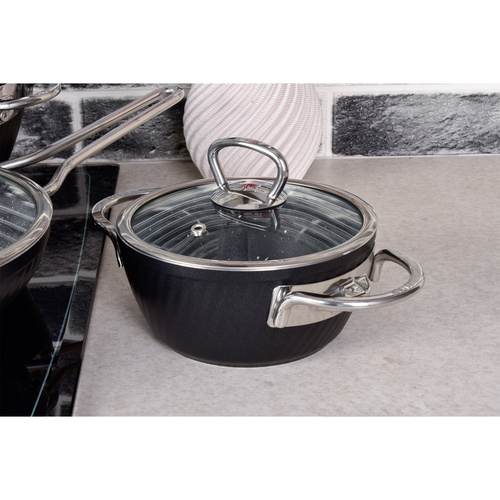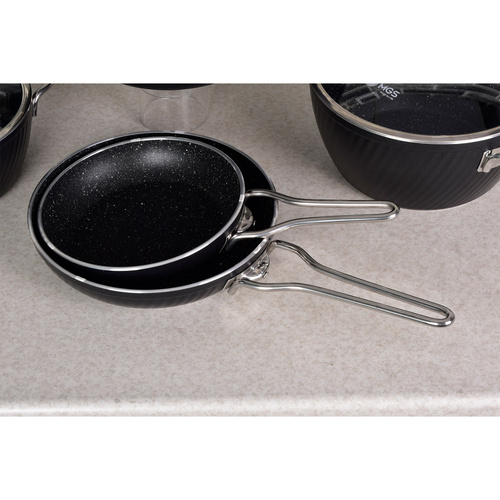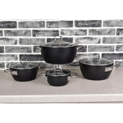 شامل : تابه تک دسته سایز 20 همراه درب, تابه تک دسته سایز 24 همراه درب , قابلمه سایز 20 همراه درب, قابلمه سایز 24 همراه درب, قابلمه سایز 28 همراه درب