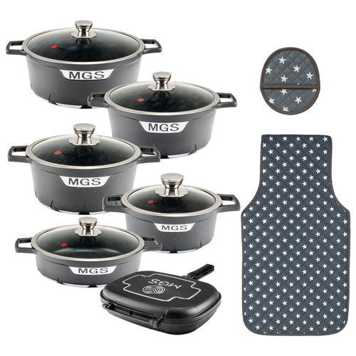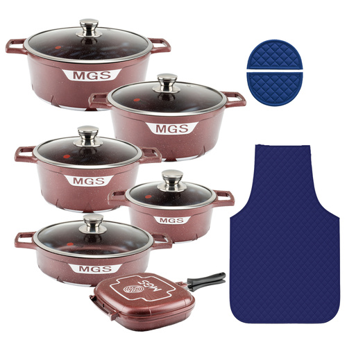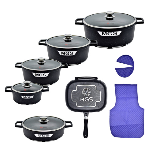 سرویس قابلمه 15 پارچه گرانیت طرح جرمنی C یک سرویس ظروف پخت و پز عالی برای هر سلیقهای است. این ست شامل چهار قابلمه در سایزهای 20/24/28/32 و تابه دو دسته سایز 28 بعلاوه یک تابه دوطرفه، دو عدد دستگیره و یک عدد پیشبند میباشد.