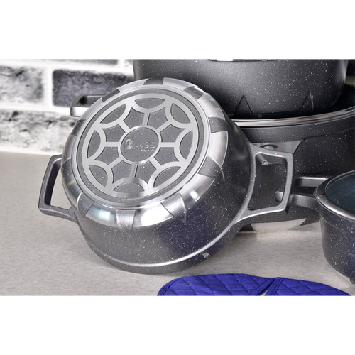 این سرویس قابلمه 15 پارچه جرمنی شامل پنج قابلمه و پنج درب پیرکس بعلاوه یک تابه تک دسته، یک عدد پیشبند و دو عدد دستگیره است. جنس روکش این ست، گرانیت نچسب است. نحوه ساخت این سرویس قابلمه 15 پارچه دایکست و دستههای آن به بدنه متصل است.