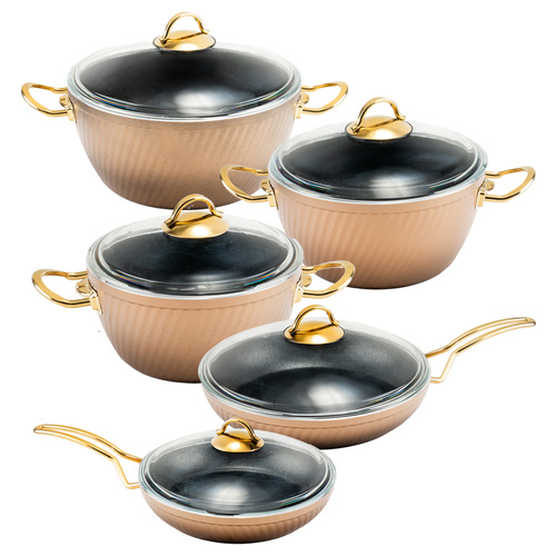 این سرویس قابلمه 10 پارچه طرح ماینز شامل سه قابلمه و سه درب پیرکس بعلاوه دو تابه تک دسته همراه درب است. جنس روکش این ست، گرانیت نچسب است. نحوه ساخت این سرویس قابلمه 10 پارچه فورج و دستههای آن به بدنه متصل شده است.