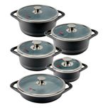 سرویس قابلمه 10 پارچه طرح ایتالیا B کد IB1019 یک سرویس ظروف پخت و پز، شامل چهار قابلمه با قطر 16 سانتی متر، 20 سانتی متر، 24 سانتی متر، 28 سانتی متر و یک تابه دو دسته با قطر 28 سانتی متر است.