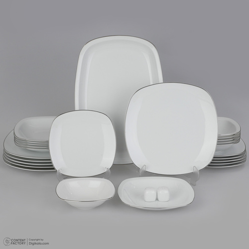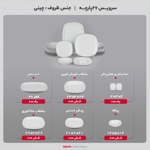 این سرویس شامل 27 قطعه از جمله یک عدد دیس، شش عدد بشقاب غذاخوری، شش عدد بشقاب خورشخوری، شش عدد پیشدستی، شش عدد پیاله، دو عدد نمکپاش و فلفلپاش بسیار زیبا است. همه این قطعات با استفاده از چینی با کیفیت بالا ساخته شدهاند و شما میتوانید به راحتی آنها را داخل ماشین ظرفشویی هم بشورید. این ظروف برای استفاده روزانه و یا در مهمانیهای خاص و مهم مناسب هستند. چینی زرین ایران، برندی برجسته و معروف در زمینه تولید و عرضه محصولات چینی با کیفیت بالا و طراحیهای شگفتانگیز است.