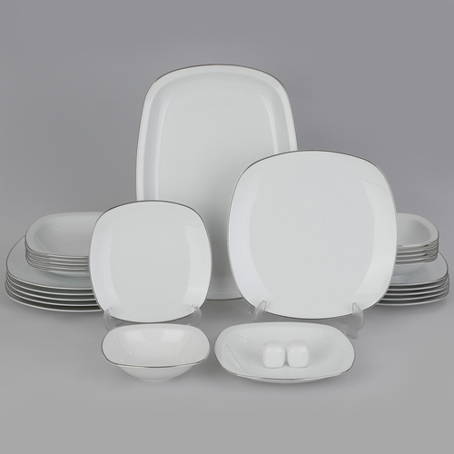 سرویس چینی 27 پارچه غذاخوری چینی زرین ایران سری کواترو مدل سمن یک انتخاب بینظیر برای افرادی است که به دنبال تجربهای متفاوت و شیک برا پذیرایی از مهمانهای خود در موقعیتهای مختلف هستند. این سرویس چینی با طراحی زیبا و جزئیات دقیق، جلوهای بینظیر به میز شما میبخشد. با ترکیب لبههای مشکی در پس زمینه سفید، زیبایی و لطافت میز ناهارخوری شما دوچندان خواهد شد.