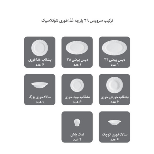 سرویس غذاخوری 29 پارچه چینی زرین سری نئوکلاسیک مدل دلسا شامل:
