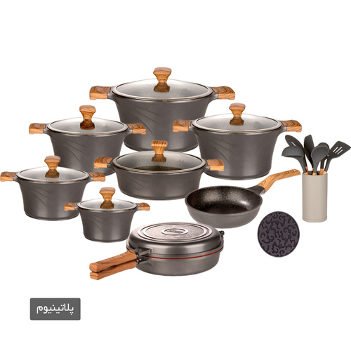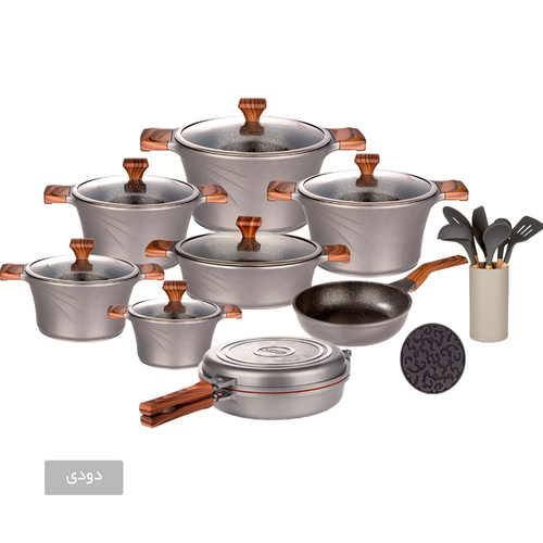 این سرویس شامل: یک عدد قابلمه سایز 16 یک عدد قابلمه سایز 20 یک عدد قابلمه سایز 24 یک عدد قابلمه سایز 28 یک عدد قابلمه سایز 32 یک عدد تابه دودسته سایز 28 یک عدد تابه دوبل گرد سایز 28 یک عدد تابه تکدسته سایز 24 هفت پارچه کفگیر و ملاقه سیلیکونی یک عدد زیرقابلمه ای سیلیکونی
